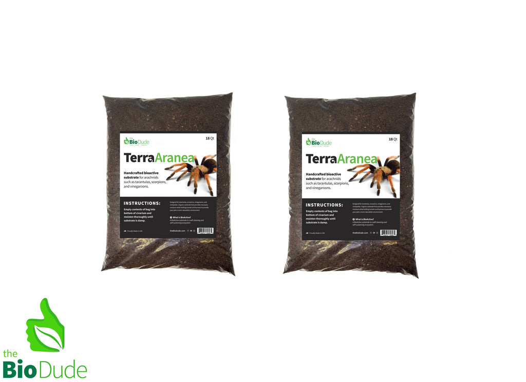 The BioDudes handcrafted bioactive substrate for Tarantulas, Scorpions, Spiders, Vinegaroons and other invertebrates. Terra Aranea is a one of a kind substrate that was thoroughly tested for over a year prior to it's release in 2019. Terra Aranea substrate is specifically designed for all biomes that can get very dry and arid or in a high humidity biome. This substrate is designed to hold the perfect amount of water while allowing for evaporation, preventing anaerobic bacteria growth, which is a common fight when dealing with inverts and terrariums. When used in conjunction with the Bio Shot, it will not only help outcompete negative bacterias and mold, it encourages the full self-cleaning, self-maintaining bioactive environment, while ensuring your invert gets the exact husbandry they need, without the worry of harmful molds and bacterias. Terra Aranea also retains all burrows and hides. I have found this substrate brings out many of the instinctual niches that many different invertebrates do in their daily life. Not only does it hold a burrow, it also holds a complete tunnel when the moisture content is held at 25%-75%. Terra Aranea provides excellent organic nutrition for your vivarium by creating necessary air pockets for root development and plant health. These air pockets are also necessary for the springtails and isopods to create a sustainable population in the vivarium.